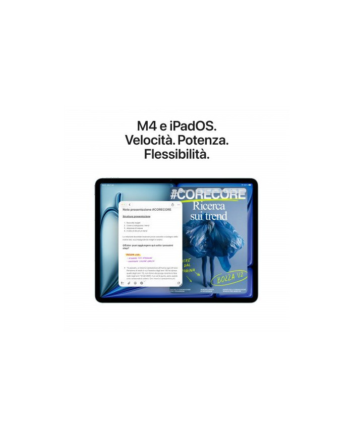 iPad Air 11". Progettato per Apple Intelligence. iPad Air, ora con i superpoteri di M4. Incredibile, nelle prestazioni e nel prezzo. Ha uno splendido display Liquid Retina, una videocamera frontale Center Stage da 12MP per videochiamate perfette, iPadOS e il Wi Fi 7 e il 5G ultrarapidi. Inoltre puoi usarlo con Apple Pencil Pro, con la Magic Keyboard per iPad Air e con altri accessori, per lavorare, studiare, giocare e creare facilmente, anche in multitasking.